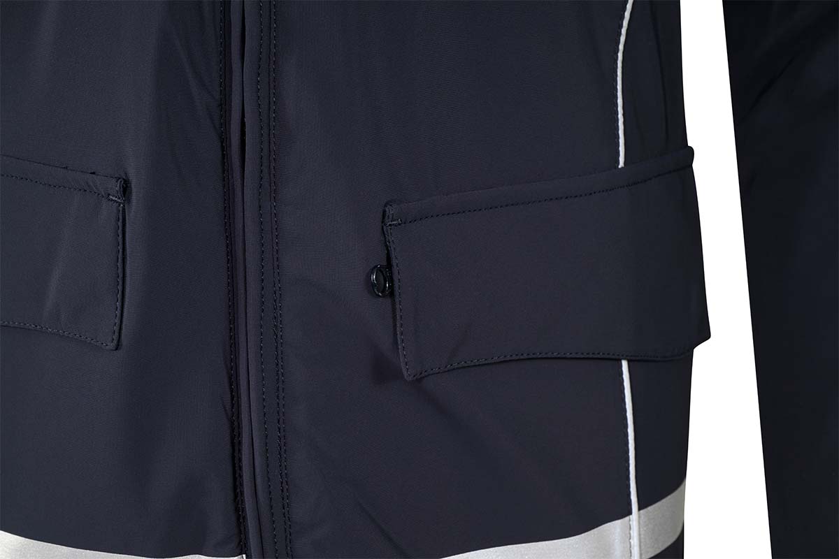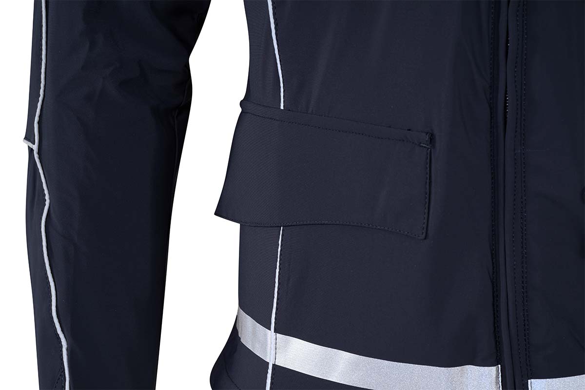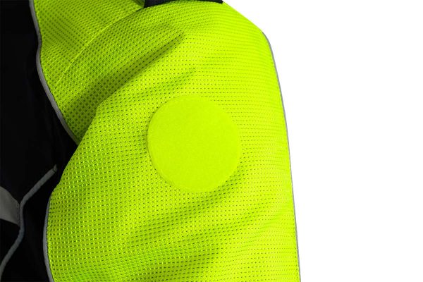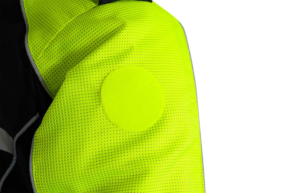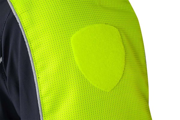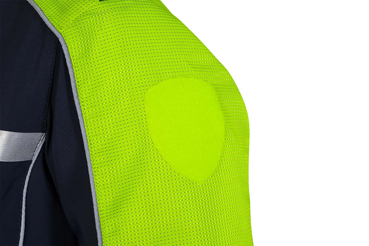- Inserti in tessuto di rinforzo rifrangente applicati su collo, spalle e maniche