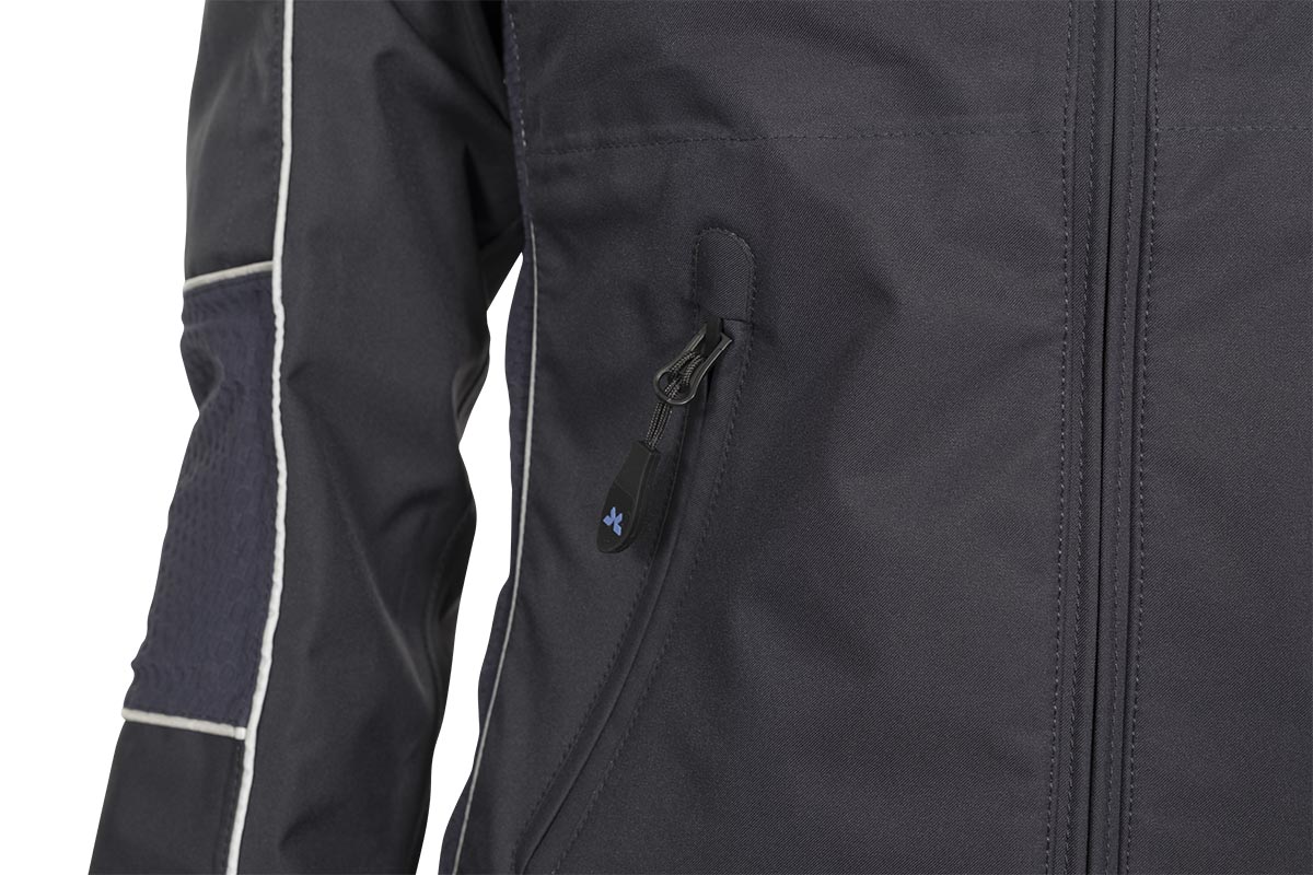 - Due tasche inferiori laterali a taglio obliquo chiuse da zip plastica water repellent