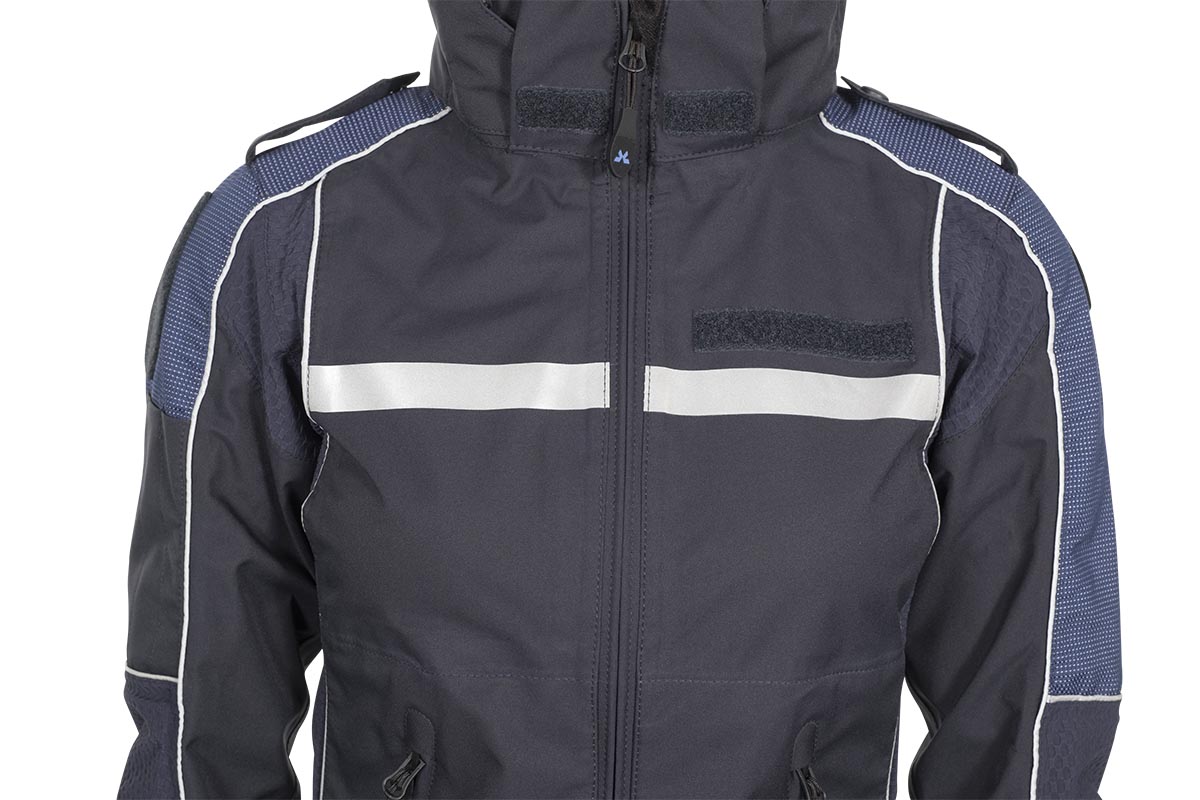 - Inserti in tessuto di rinforzo rifrangente applicati su collo, spalle e maniche